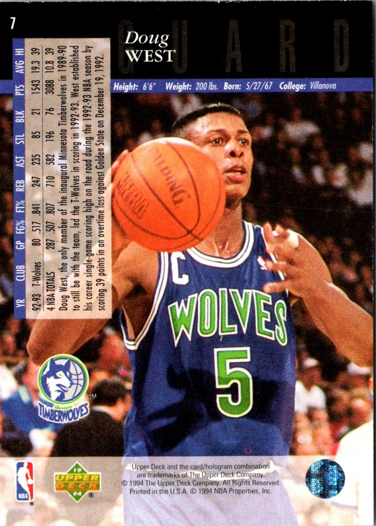 This 1993 Upper Deck Special Edition Electric Court Doug West card of the Minnesota Timberwolves is sure to please any basketball card collector. It features a great black and white image of West in his Timberwolves uniform, and has all the usual stats and information on the back. This card is in mint condition and would make a great addition to any collection. Get it now and add it to your collection today!