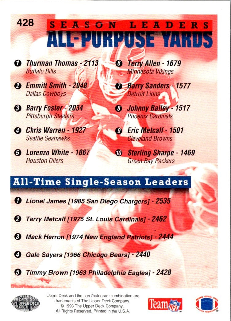 This 1993 Upper Deck Thurman Thomas #428 Buffalo Bills card is a must-have for any football fan. This card features an action shot of one of the greatest running backs of all time, Thurman Thomas, during his time with the Buffalo Bills. Show your support for the Bills and add this card to your collection today!