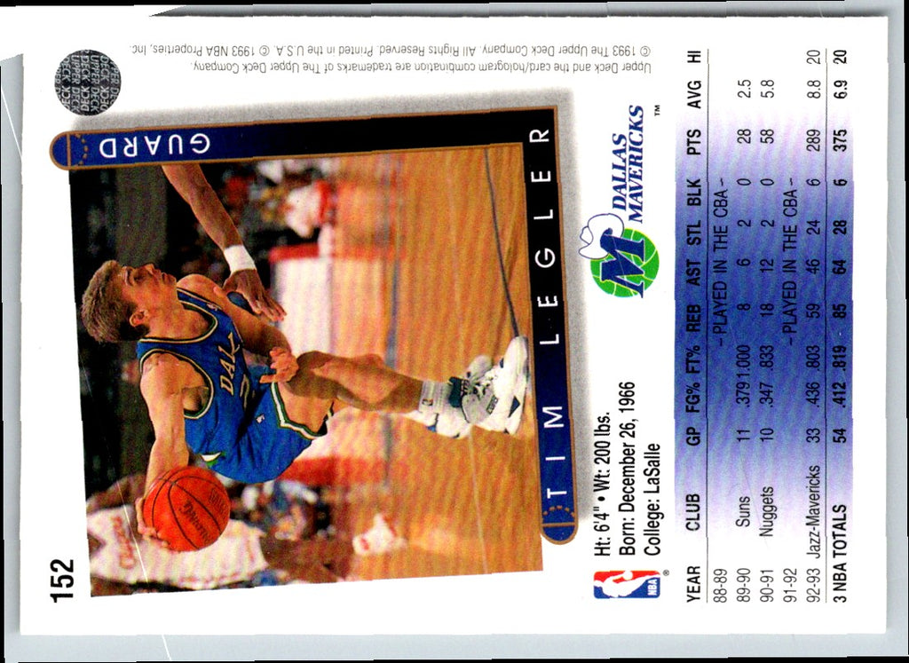 This 1993 Upper Deck Tim Legler #152 Dallas Mavericks card is an absolute must-have for any basketball collector. He was a three-time NBA All-Star and one of the most prolific three-point shooters in the league. This card features a great action shot of Legler in his Mavericks uniform, and the back of the card includes his career stats and highlights. Add this card to your collection today and show your appreciation for one of the NBA's all-time great players.