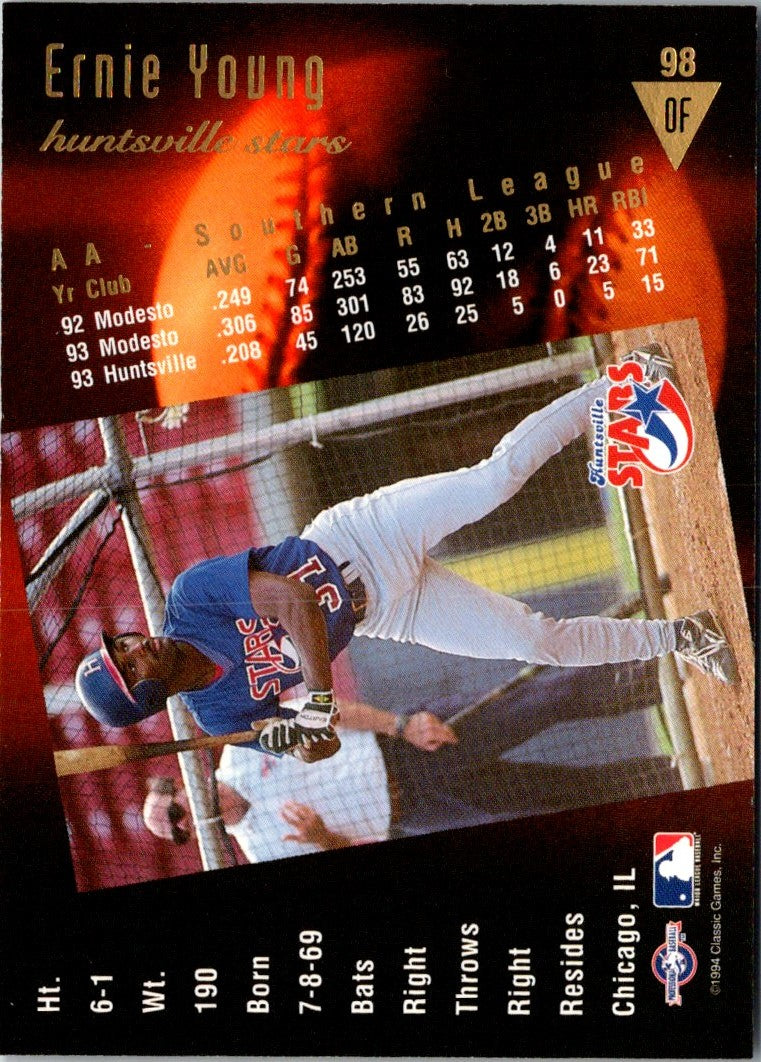 The 1994 Classic Best Gold Ernie Young #98 Huntsville Stars trading card is a must-have for any sports collector. Featuring a classic image of Ernie Young, this card is sure to be a standout in any collection. With full-color images and a glossy finish, this card is a unique and valuable collectible. It is sure to become a prized addition to any sports fan's collection. Whether you are a fan of the Huntsville Stars or just Ernie Young, this card is the perfect way to express your love and admiration for the game. Don't miss out on your chance to add this card to your collection today!