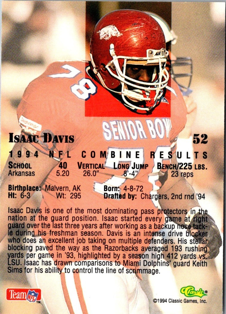 1994 Classic NFL Draft Isaac Davis #52 San Diego Chargers - The perfect item for any NFL fan! This classic jersey is from the 1994 NFL draft and features the San Diego Chargers and the number 52 of Isaac Davis. Featuring vibrant colors and a comfortable fit, it's the perfect way to show your love for the NFL. Wear this classic jersey proudly and show your support for one of the greats!