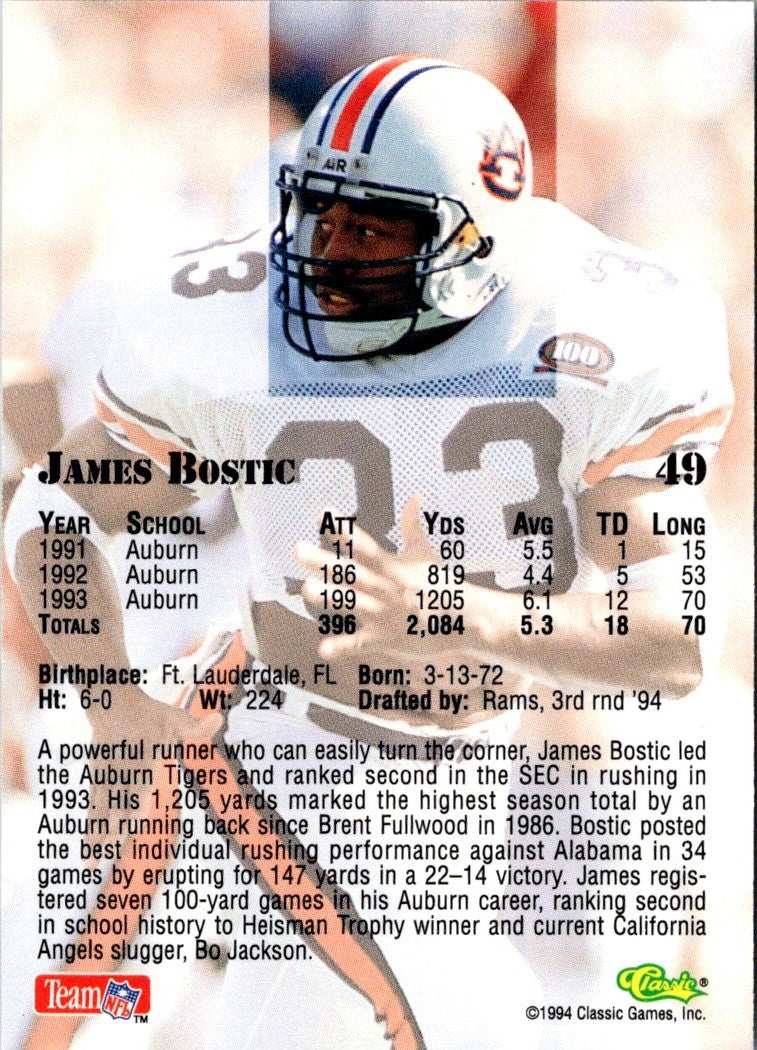 1994 Classic NFL Draft James Bostic #49 Los Angeles Rams is a must-have for any Rams fan. This item is a replica of the original jersey worn by Bostic during the 1994 NFL draft, with the classic LA Rams colors and logo. It features a comfortable and lightweight design, perfect for wearing on game day or just showing your team pride. The jersey is made from a breathable and durable material, ensuring it will keep you comfortable no matter how active you are. With this jersey, you can show your support for the Rams and Bostic, while also representing your team with style.