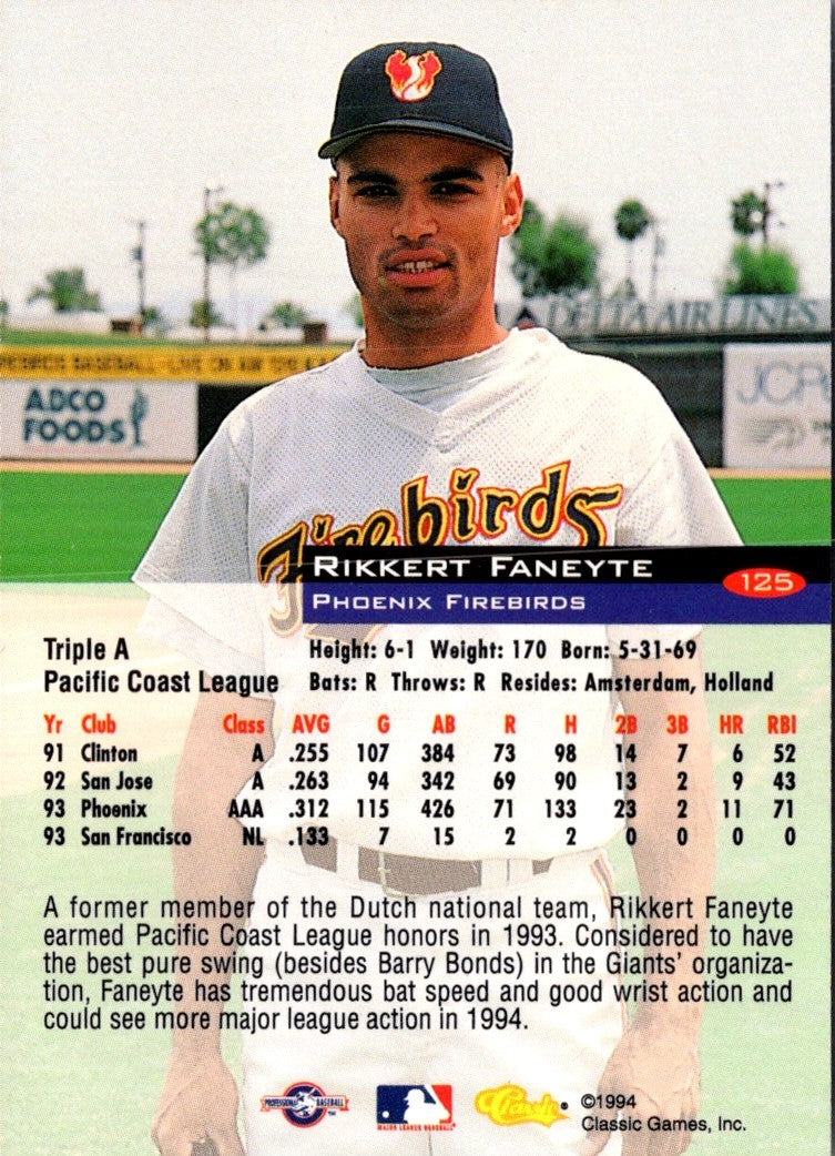 The 1994 Classic Rikkert Faneyte #125 Phoenix Firebirds is an incredible piece of baseball memorabilia for any collector. This card features Faneyte, a former backup catcher for the Firebirds, in a classic batting stance and is sure to bring a smile to any fan's face. The card is printed on thick stock paper with vibrant colors that pop off the page and a glossy finish to make it stand out. With its unique design, it's perfect for framing and displaying in any home or office. Show your support for the Firebirds by collecting this iconic card today!
