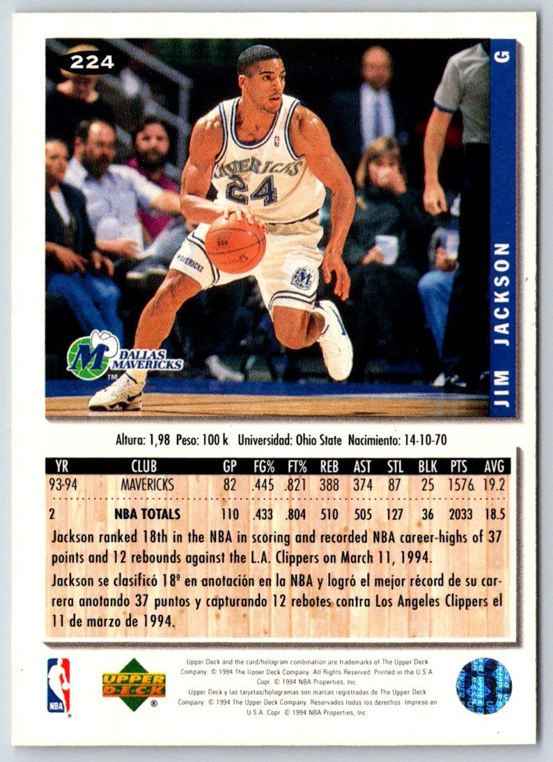 This 1994 Collector's Choice Jim Jackson #224 Dallas Mavericks card is a must-have for any NBA fan. Featuring a full-color action photo of Jackson on the front, this card is a great way to commemorate the legendary guard's illustrious career. With bold graphics and vibrant colors, this card is sure to stand out in any collection. An attractive addition to any basketball card collection, the 1994 Collector's Choice Jim Jackson #224 Dallas Mavericks card is a must-have for any sports enthusiast.