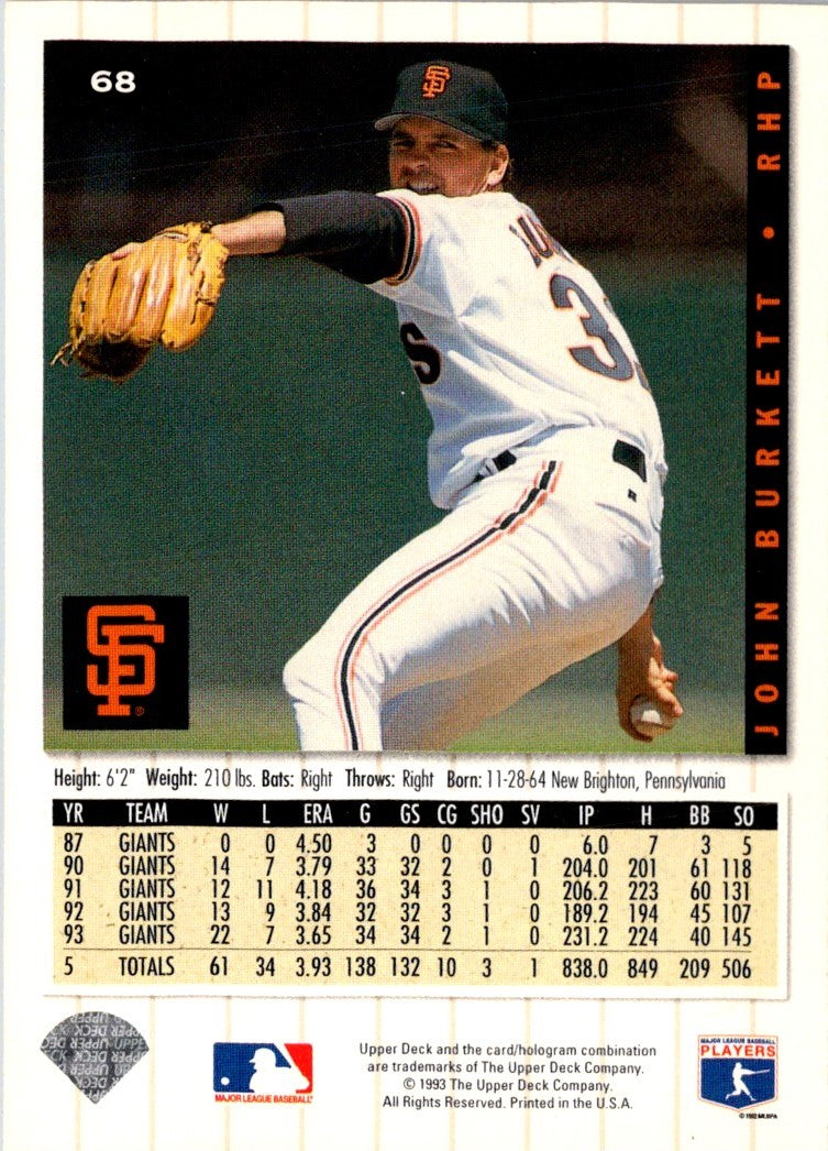 This 1994 Collector's Choice John Burkett #68 San Francisco Giants card is an essential piece for any baseball fan. Burkett was an All-Star pitcher during his career and was part of the Giants rotation from 1993 to 1996. The card features Burkett in his Giants uniform and showcases the team's iconic orange and black colors. Add this card to your collection and celebrate the career of one of the greatest pitchers in Giants history.