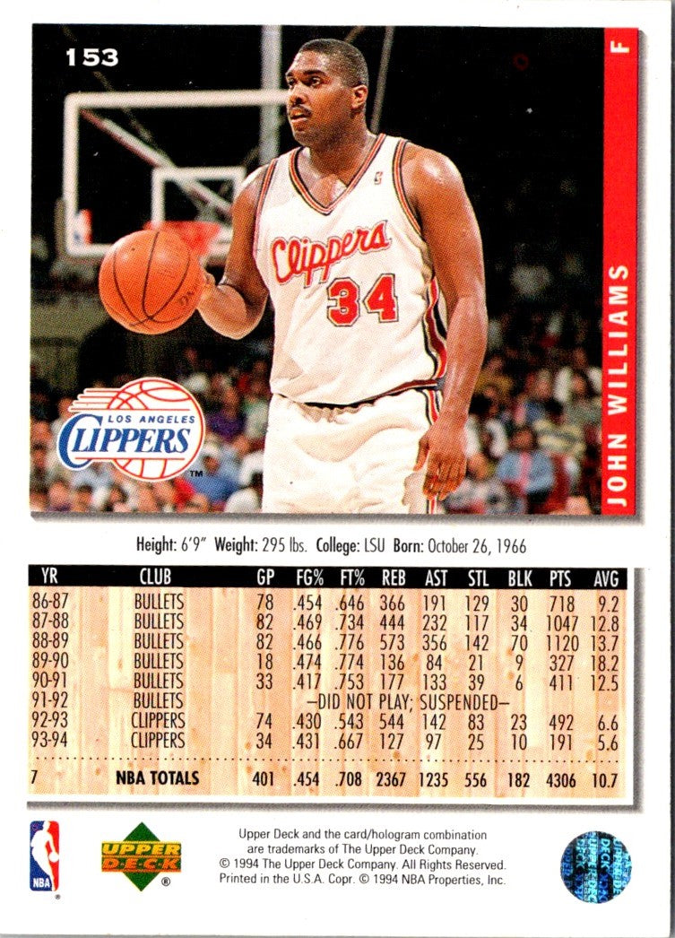 This 1994 Collector's Choice John Williams #153 Los Angeles Clippers card is a must-have for any fan of the legendary player. This card features a full-color front and back with detailed stats and a classic action shot of Williams. The card is in near-mint condition and is a great addition to any sports card collection. Add this piece of nostalgia to your collection today and celebrate the career of a true legend!