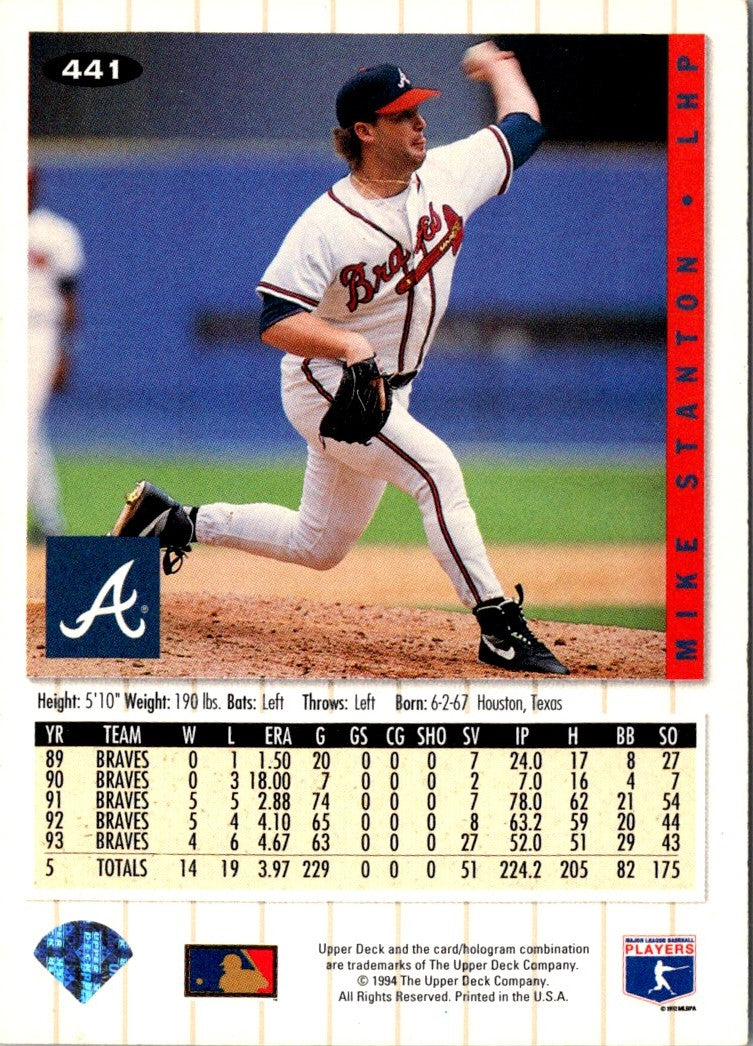 This 1994 Collector's Choice Mike Stanton #441 Atlanta Braves card is a must-have for any baseball fan. It features a sharp full-color portrait of the former Braves outfielder, along with his vital stats on the back. This card is a great way to commemorate a great career and make a great addition to any collection. Don't miss out on this piece of sports history!