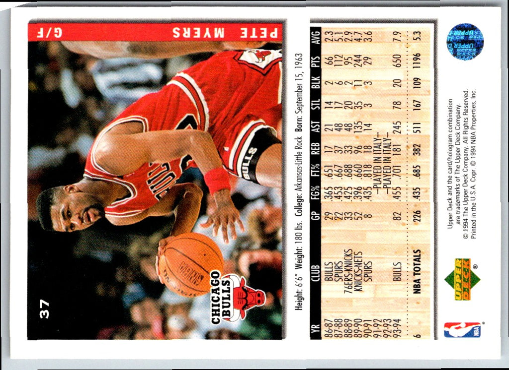 This 1994 Collector's Choice Pete Myers #37Chicago Bulls card is a great addition to any basketball fan's collection. It features a full-colour photo of Myers in his Bulls uniform and is sure to bring back memories of one of the most iconic teams in NBA history. The card is printed on high-quality card stock with a glossy finish and is sure to last for years to come. The back of the card includes Myers' stats and a brief biography of his career. Add this iconic piece to your collection today and show your support of the Bulls!