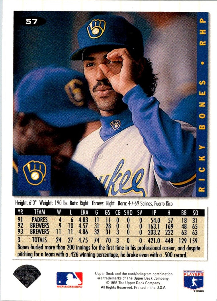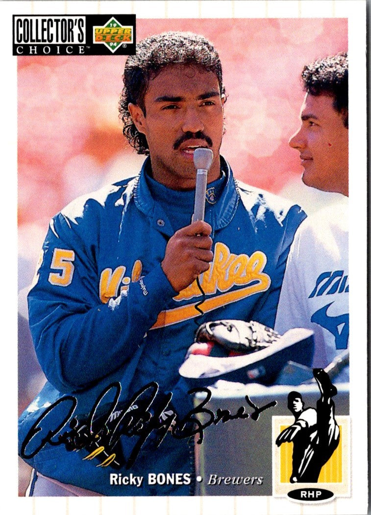 This #57 Ricky Bones card from the 1994 Collector's Choice set is a must-have for any Milwaukee Brewers fan! The card has a glossy finish, vibrant colors, and detailed images of Ricky in action. This card will make a great addition to any collection. Own a piece of history and get your hands on this Ricky Bones card today!