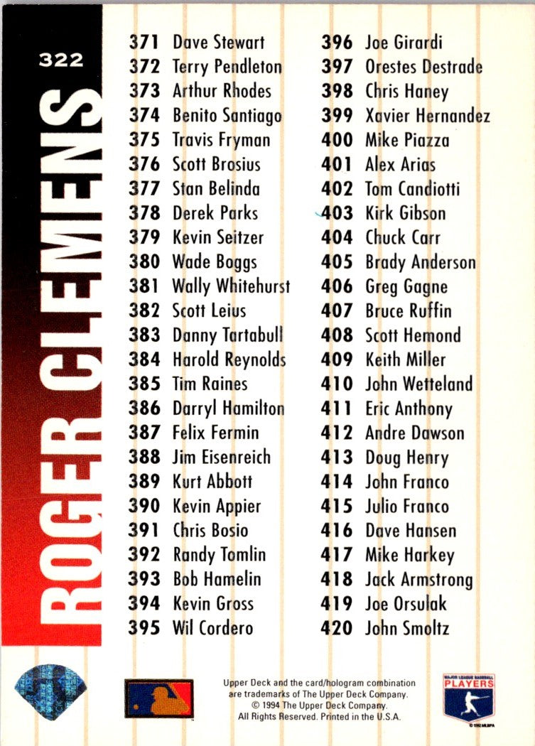 This 1994 Collector's Choice Roger Clemens #322Boston Red Sox card is a must-have for any collector of baseball memorabilia. It features the iconic pitcher in a classic action shot, wearing his home Red Sox uniform. This card is an original from the 1994 season, and is a great addition to any collection. It is also a great gift for any Red Sox fan. Get your hands on this piece of history today!
