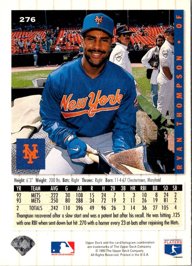 This Ryan Thompson card from the 1994 Collector's Choice set is a must-have for any New York Mets fan. With its beautiful design and intricate details, it is sure to be a stand-out piece in any collection. From the vibrant colors to the crisp image of Ryan Thompson, this card is sure to make a great addition to any Mets fan's collection. Show your support for the team with this classic card!
