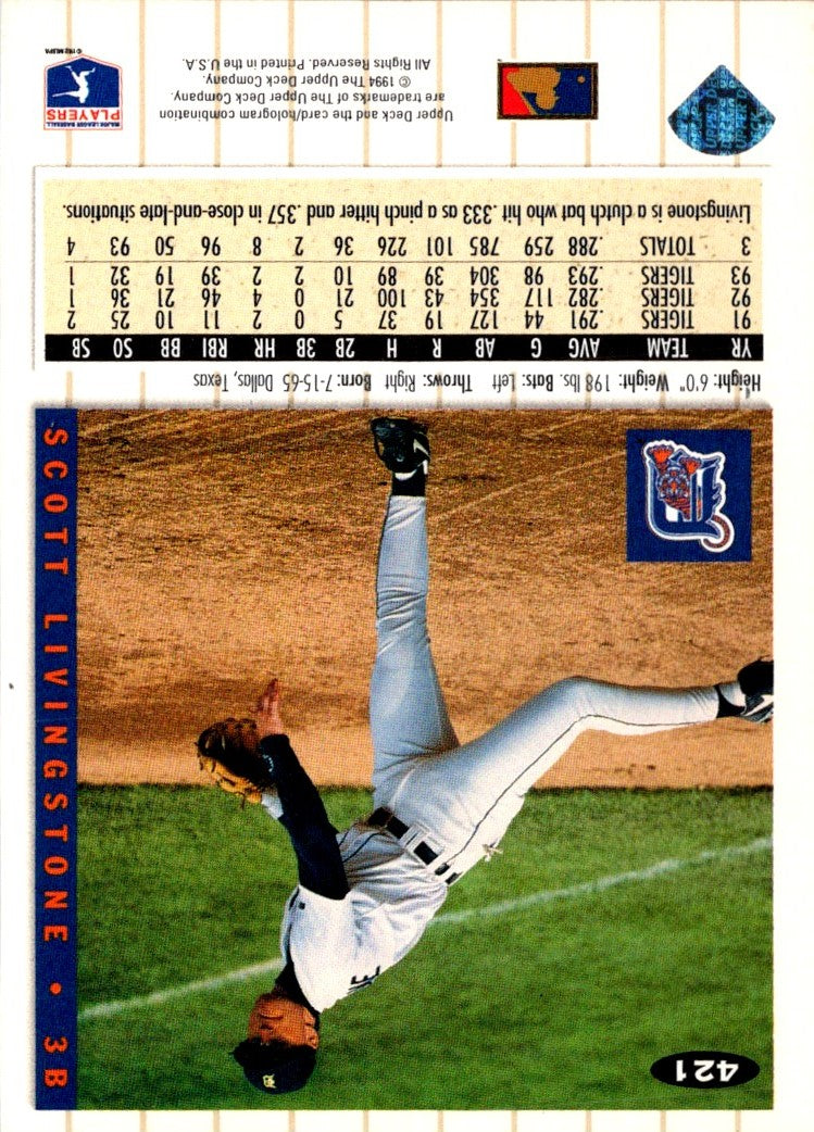 This 1994 Scott Livingstone #421 Detroit Tigers card is a must-have for any collector. Featuring a classic image of the beloved Tiger, this card will bring back memories of the glory days of the team. Released in 1994, this card is a timeless piece of memorabilia that will make a great addition to any collection. The card is in near-mint condition and features vivid colors, making it a great display piece. Add this card to your collection and show your support for the Detroit Tigers!