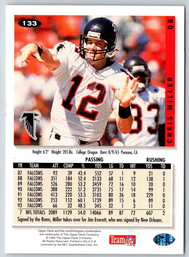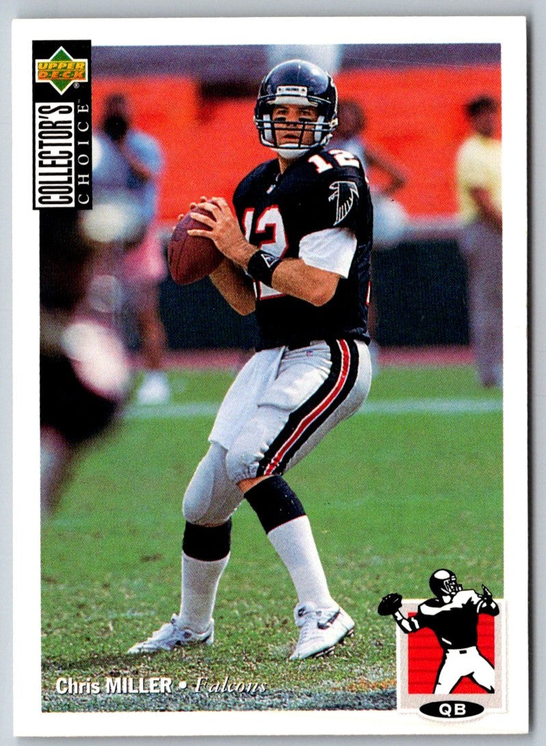 This 1994 Collector's Choice Silver Chris Miller #133 Atlanta Falcons card is a must-have for any football card collector. The card features a silver foil stamping of Miller's last name, team logo, and the Collector's Choice logo. The card also features a glossy finish and the card back includes Miller's full stats and bio. This card is perfect for any Falcons fan or football card enthusiast. Add this timeless card to your collection today!