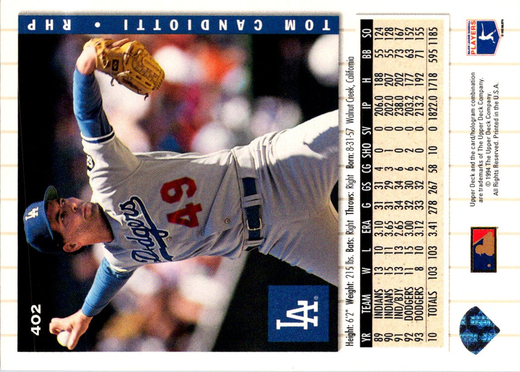 This 1994 Collector's Choice Tom Candiotti #402 Los Angeles Dodgers trading card is the perfect item to add to your Dodgers collection. Featuring a clear picture of Candiotti in his Dodgers uniform, the card is a great way to memorialize the pitcher's time with the team. Candiotti was a key member of the team that season, and this card captures his impressive performance with the Dodgers. It's a must-have for any Dodgers fan, so don't miss out on adding it to your collection!