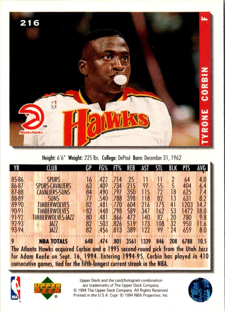 Description: 1994 Collector's Choice Tyrone Corbin #216