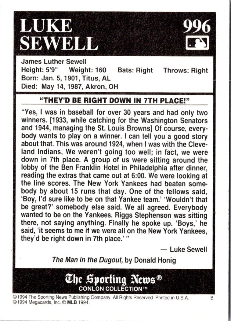 Description: 1994 Conlon Collection TSN Luke Sewell #996