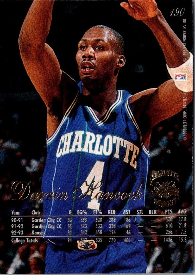 The 1994 Flair Darrin Hancock #190 Charlotte Hornets card is a must-have for any basketball card collector. This card features a vibrant full-color photo of Darrin Hancock in action for the Charlotte Hornets. The back of the card contains the player's complete stat line for the 1993-94 season. Hancock was a fan favorite for the Hornets, averaging 13.7 points and 5.4 rebounds per game during the season. Get your hands on this card today and add it to your collection!