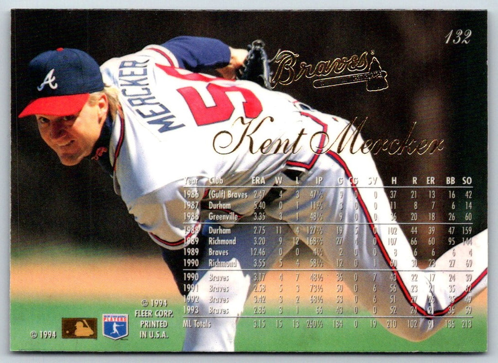 Introducing the 1994 Flair Kent Mercker #132 Atlanta Braves trading card! Featuring a full-color photo of Mercker in his Braves uniform, this card is perfect for any fan of the Atlanta Braves and baseball card collectors alike. This card is in near-mint condition, making it a must-have for any collector. Add this card to your collection today and show your team pride!