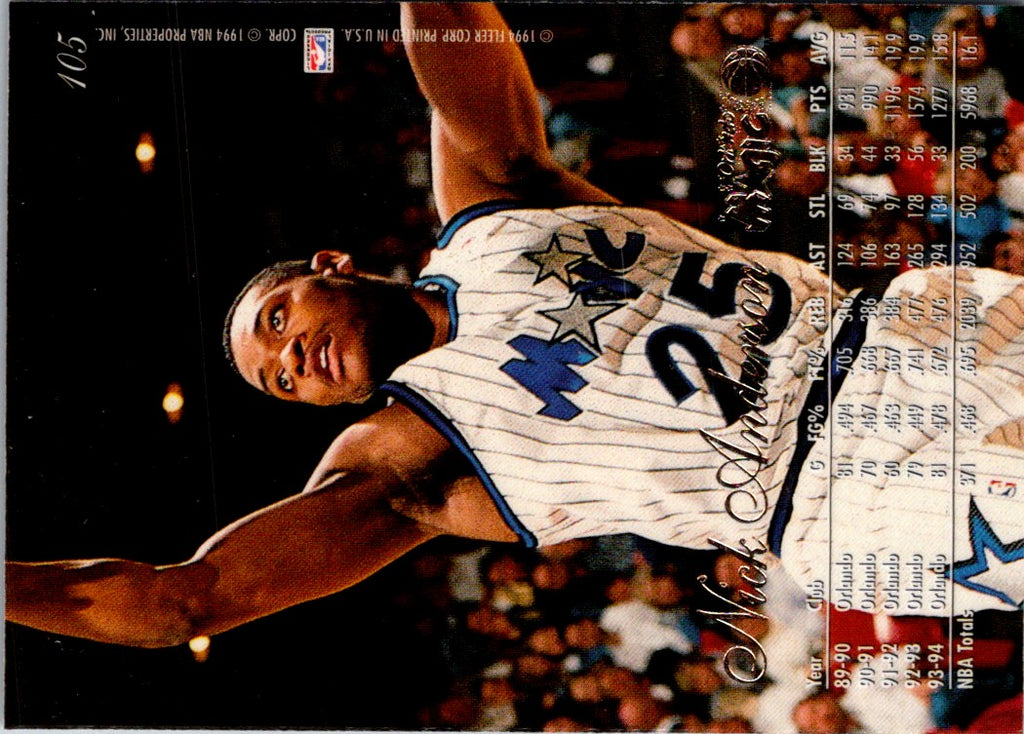 This 1994 Fleer Nick Anderson #105 card from the Orlando Magic is a must-have for any Magic fan's collection! Anderson is seen in full uniform on the court, ready to make a big play. With his signature goggles, this card is a great way to commemorate a great player. This card is in great condition, featuring bright colors and sharp corners. Don't miss out on this chance to add this card to your collection!