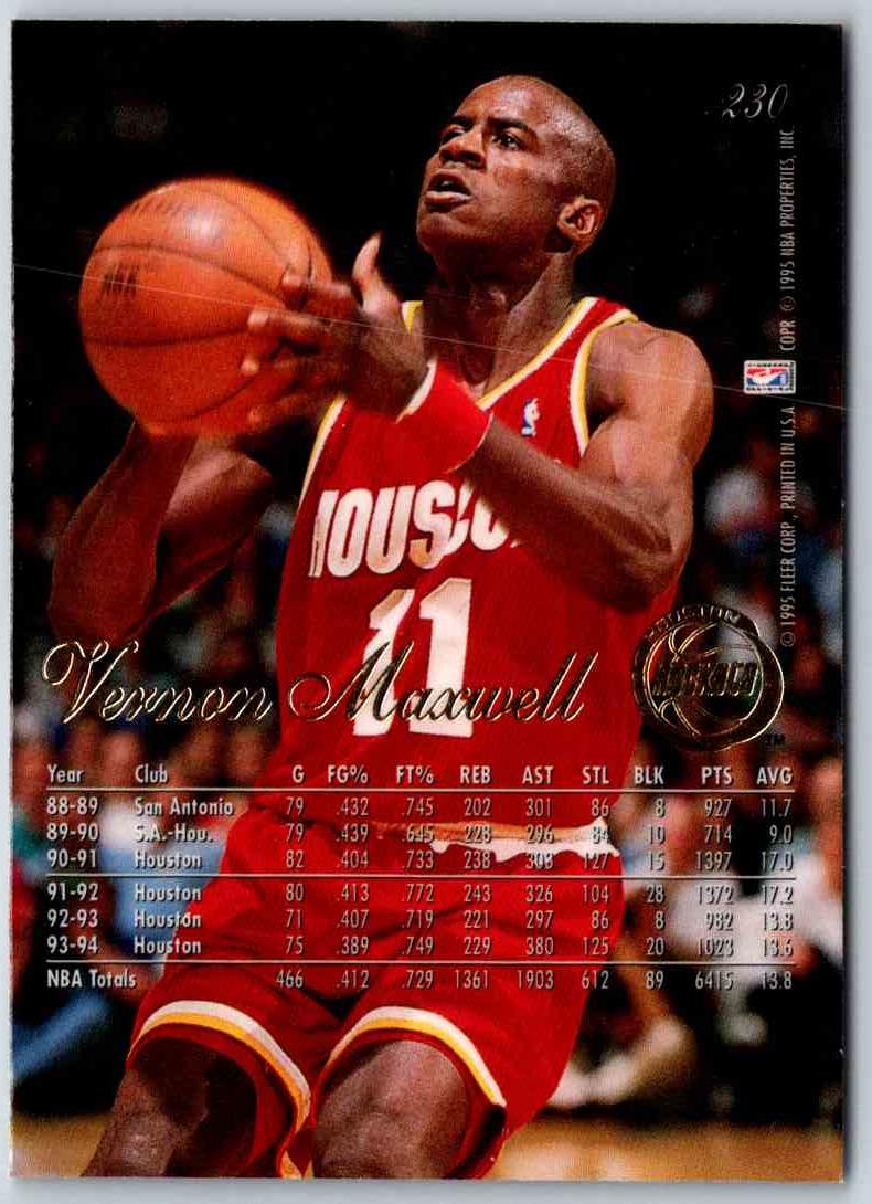 This 1994 Flair Vernon Maxwell card #230 features Maxwell in his Houston Rockets uniform. His powerful slam dunk and intense concentration are captured in this card. With vibrant colors and a glossy finish, this card is sure to be a standout in any collection. A great addition to any basketball fan's collection, this card will make a great gift.