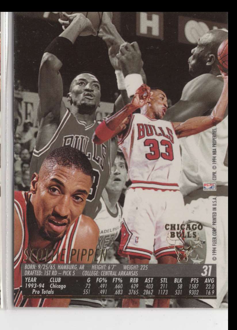 1994 Fleer Ultra Scottie Pippen #33 Chicago Bulls card is a must-have for basketball card collectors. This classic card features a close-up of the iconic Scottie Pippen in action with the Chicago Bulls. His image is framed by a bold, red border with the Fleer Ultra logo along the bottom. The back of the card includes a brief biography and career highlights of the Hall of Famer. With its vibrant colors and timeless design, this card is sure to be a prized addition to any collection.