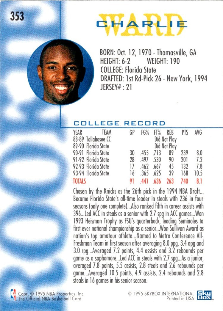 Charlie Ward's 1994 Hoops #353 card is a must-have for any New York Knicks fan. This collectible card captures the All-Star point guard in his iconic orange and blue uniform, ready to take the court and lead the team to victory. With his intense focus and determination, Ward was one of the most beloved players of his era. This card is a great way to honor his legacy and show your love for the Knicks. Add this card to your collection today and celebrate one of the greatest players in Knicks history.