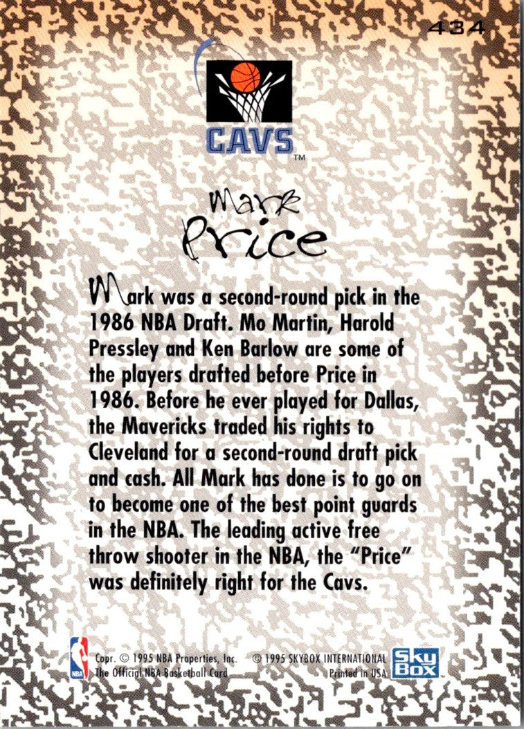 This 1994 Hoops Mark Price #434 Cleveland Cavaliers trading card is a must-have for any basketball fan! Featuring an action shot of Cleveland's All-Star point guard, this card is sure to bring back fond memories of his time with the Cavs. Great for any collection, the card is in excellent condition and ready to be displayed. Make sure to add this card to your collection today!