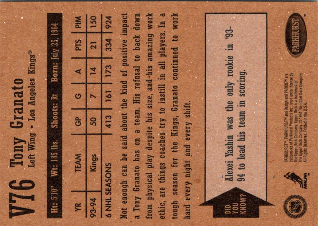 This 1994 Parkhurst Vintage Tony Granato Los Angeles Kings hockey card is a must-have for any Kings fan. Featuring a full-color portrait of Granato in his classic Kings gear, this card captures the all-star forward's prime years with the team. Printed on glossy card stock, this card is in mint condition and a great addition to any collection. It's a perfect way to show your support for Granato and your LA Kings pride.