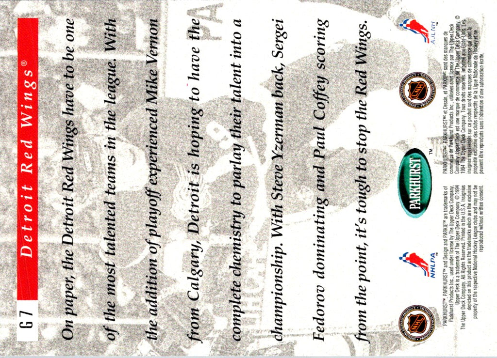 This 1994 Parkhurst You Crash the Game Gold Sergei Fedorov #G7Detroit Red Wings card is a must-have for any collector. It features an iconic image of Sergei Fedorov in his classic Red Wings uniform on the front. The card also boasts a classic Parkhurst design on the back, with a full statistical breakdown of Fedorov’s career. This card is sure to become a treasured piece of your collection. Add it to your collection today!