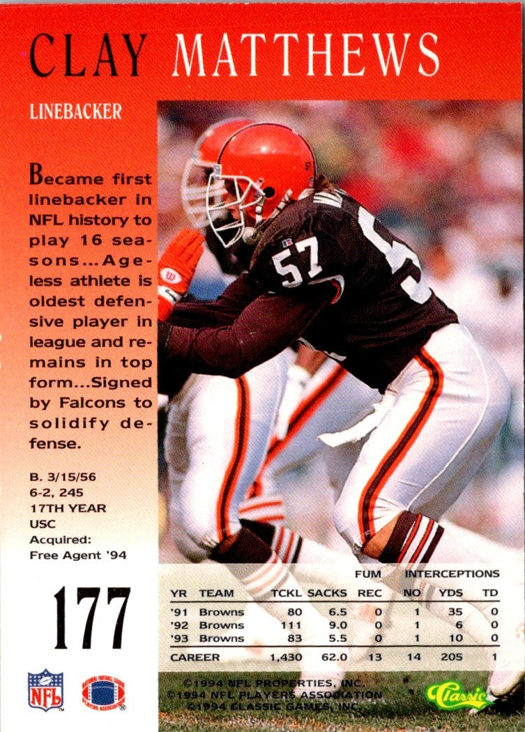 This 1994 Pro Line Live Clay Matthews #177 Atlanta Falcons card features the Pro Bowl linebacker in action. Matthews was a standout defender in the NFL, leading the league in sacks in 1996. His Pro Line Live card features a detailed image of Matthews in his Falcons jersey, ready to take down an opponent. With its mint condition and classic design, this card is a must-have for any fan of the Falcons or Matthews' career. Add it to your collection today!