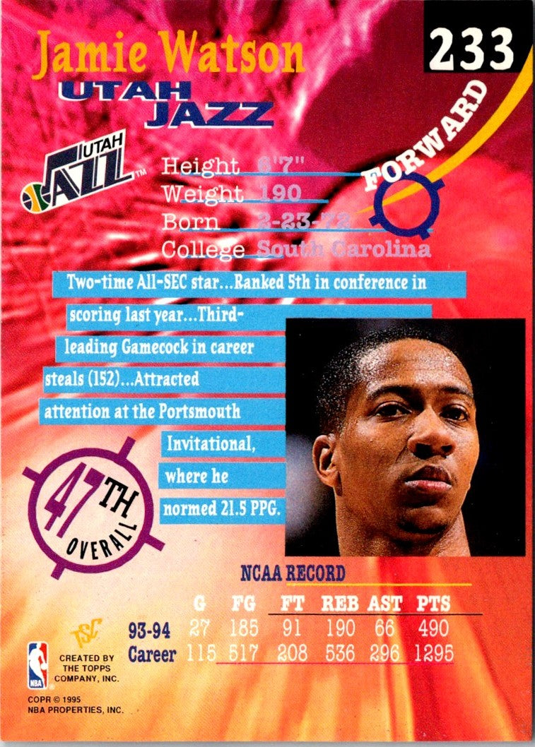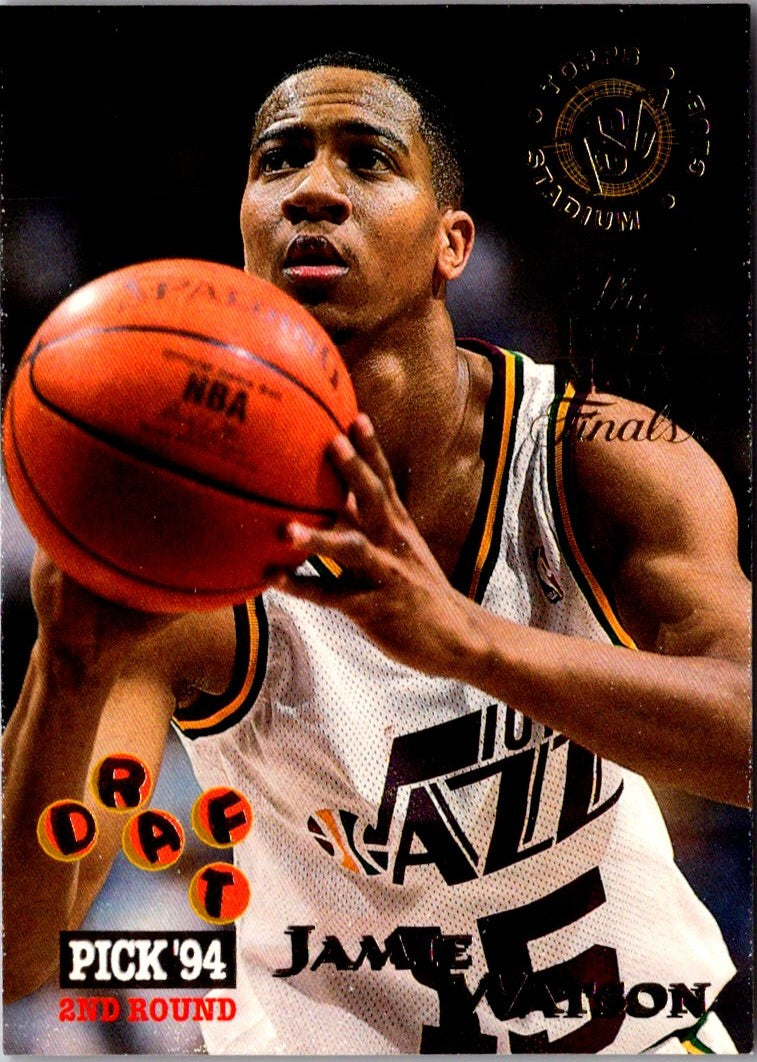 This 1994 Stadium Club Jamie Watson #233 Utah Jazz Card is the perfect addition to any basketball fan's collection. Featuring sharp, vibrant colors, it shows off Watson's classic look during his time with the Jazz. The card is in excellent condition, with no major marks or damage. It also features a full-color action shot of the star guard in action. Get your hands on this great card today and add a piece of Jazz history to your collection!