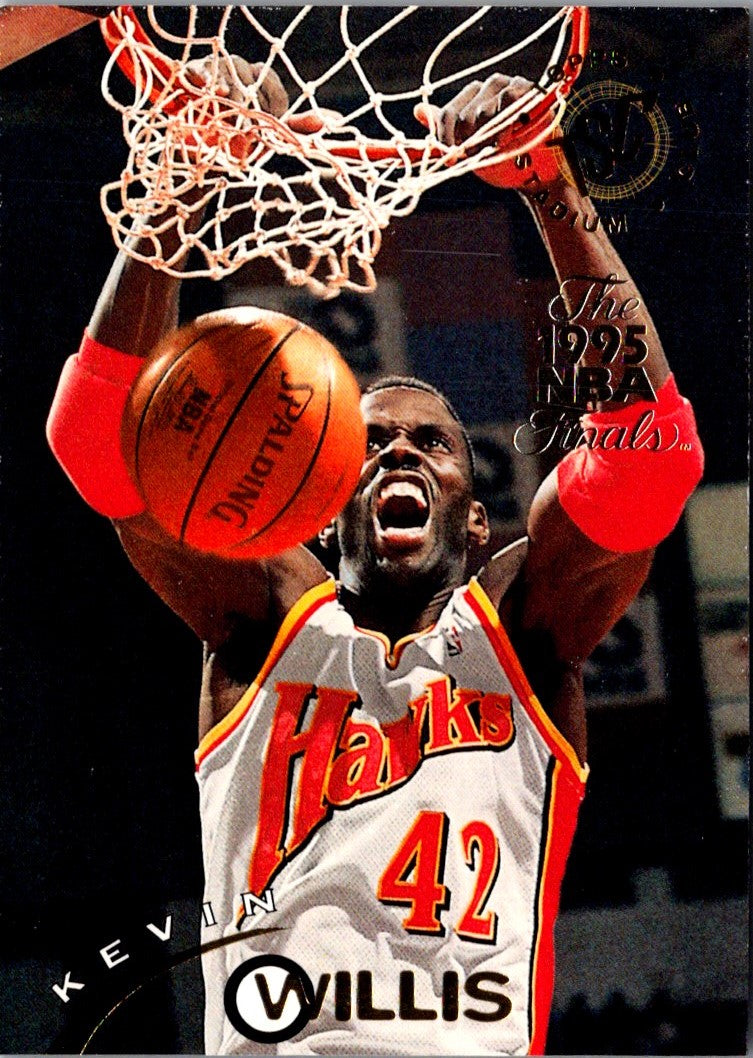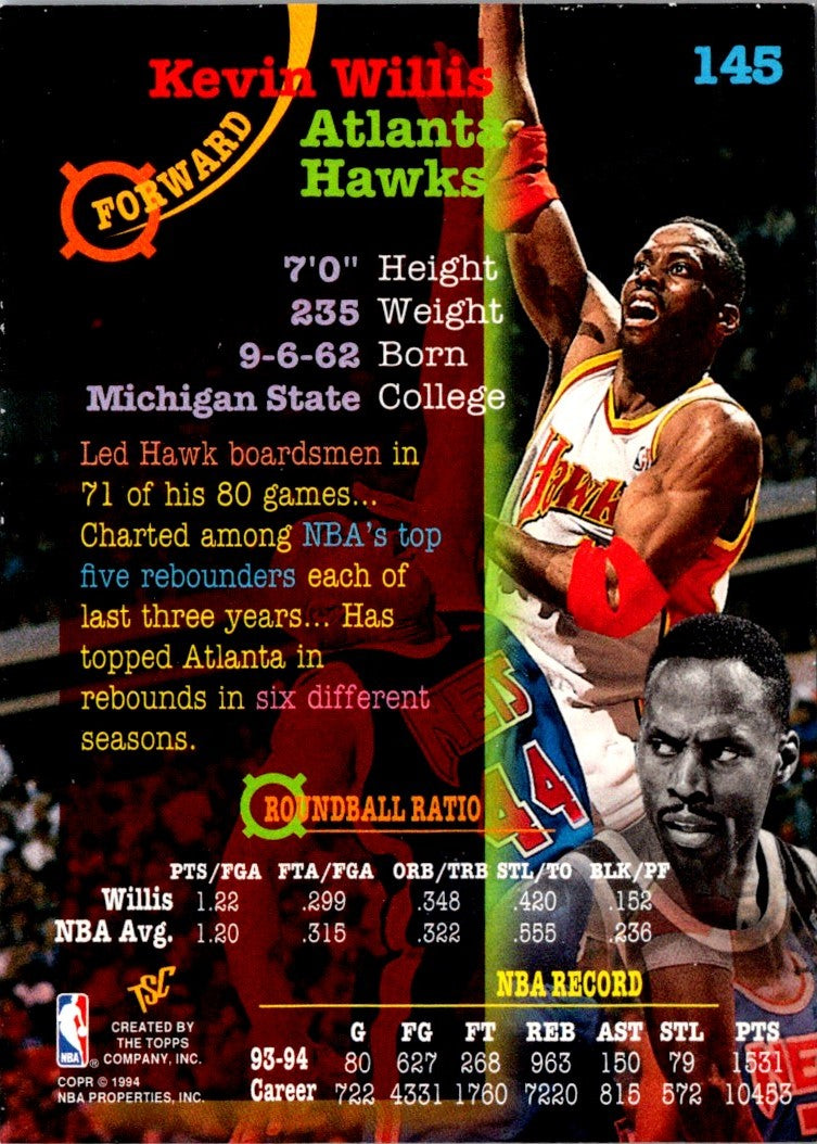 This card from 1994 Stadium Club features Kevin Willis, the power forward of the Atlanta Hawks. He was a seven-time NBA All-Star and a two-time All-NBA Second Team selection. This card shows Willis in his Hawks uniform, with a basketball background. It's a great addition to any basketball fan's collection, and would look great framed and displayed. The card is in excellent condition, and is a must-have for any Hawks fan or basketball collector.