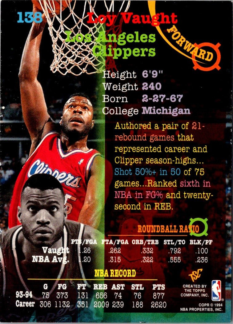This 1994 Stadium Club Loy Vaught #138 Los Angeles Clippers card is the perfect way to show your support for the team! Featuring a bold, action-packed image of Vaught in mid-game, this card is sure to please any collector. The vivid colors, intricate details, and high-quality finish make this card a must-have for any Clippers fan. Whether you're looking to add to your collection or just get started, this card is a great way to show your team pride.