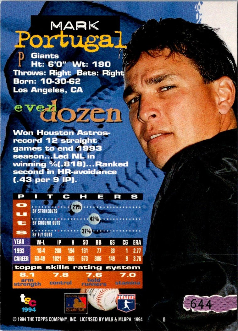 This 1994 Stadium Club Mark Portugal #644 card of the San Francisco Giants is the perfect addition to any fan's collection. Show your support for the team with this classic card that features Portugal in his Giants uniform. With its vibrant colors and sharp corners, this card is sure to be a hit with any baseball fan. Celebrate the legacy of the Giants with this timeless card. Add it to your collection today!
