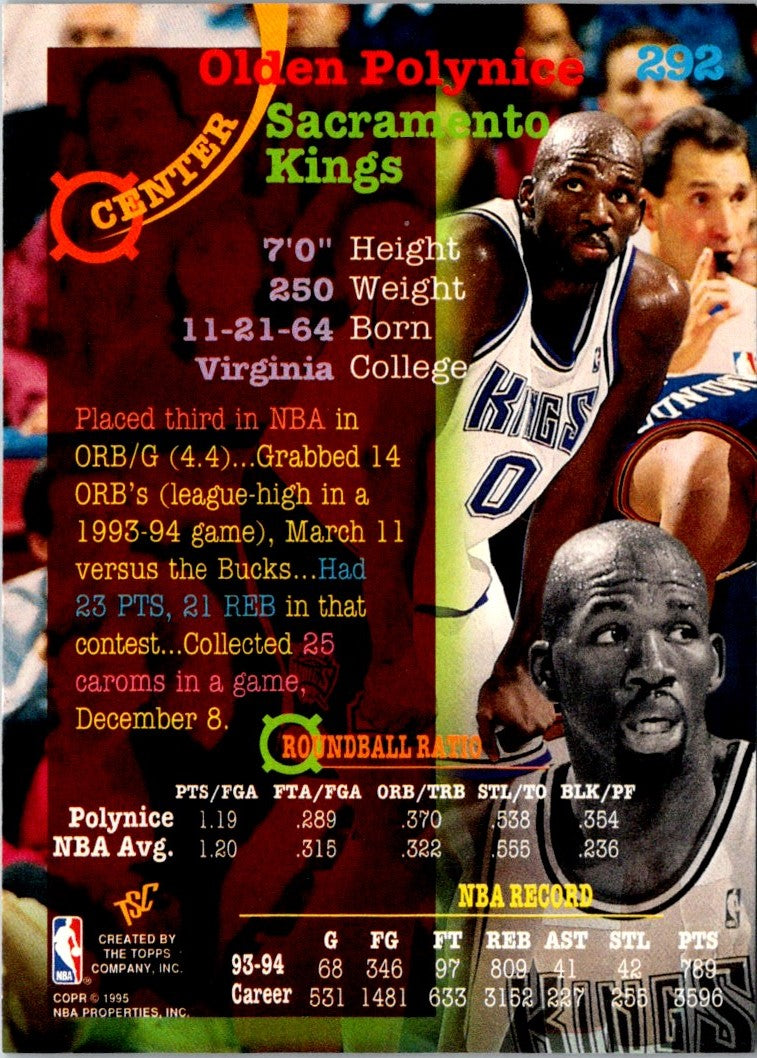 This 1994 Stadium Club Olden Polynice #292 card from the Sacramento Kings is a great piece of memorabilia for any basketball fan. Featuring a high-gloss finish and vibrant colors, this card is sure to stand out in any collection. Olden Polynice was a key player during the early part of the decade and this card captures him in all his glory. Add this card to your collection today and own a piece of Sacramento Kings history.