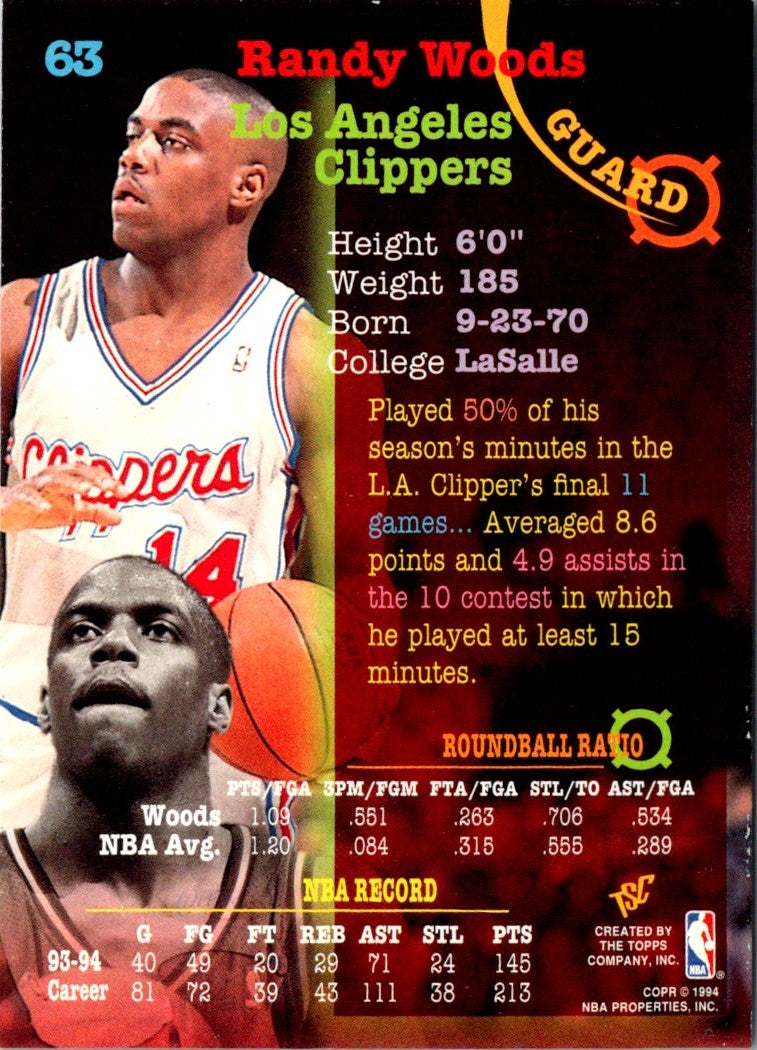 1994 Stadium Club Randy Woods #63 from the Los Angeles Clippers is an essential item for any basketball fan! This card features a full-color action shot of Woods in his Clippers jersey, with the team logo and colors. The card is printed on thick card stock and has a glossy finish for extra protection. It would make a great addition to any card collection, or a great gift for any Clippers fan. Add this card to your collection today and own a piece of basketball history!