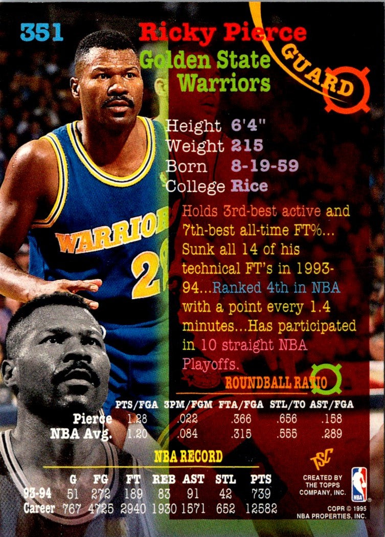 This 1994 Stadium Club Ricky Pierce #351 card from the Golden State Warriors is a great addition to any basketball card collection. Pierce was an eight-time NBA All-Star and a two-time champion. This card captures Pierce at the peak of his career during the 1993-94 season. The card features a sharp, glossy photograph of Pierce mid-shot with the classic Stadium Club design elements. It is a great way to commemorate an incredible player and memorable season. Get your hands on this card today and add a piece of basketball history to your collection.
