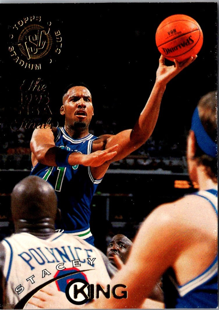 Stacey King was one of the NBA's most exciting players in the early 1990s, and his 1994 Stadium Club card is a must-have for any Minnesota Timberwolves fan. This card features a dynamic action shot of King, in full Minnesota Timberwolves uniform, ready to take the court. Show your Timberwolves pride and add this card to your collection today!