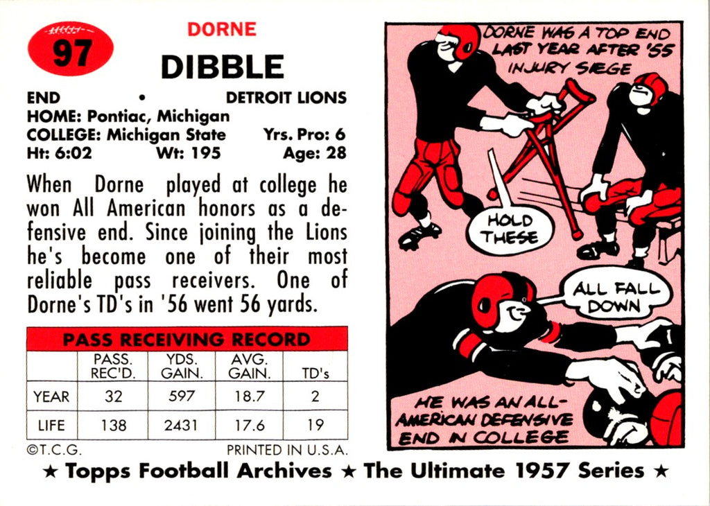 This 1994 Topps Archives Dorne Dibble #97 card is a must-have for any Detroit Lions fan. Featuring a classic image of Dibble on the field, this card is a great way to commemorate one of the team's all-time greats. With its crisp design and sharp edges, it's sure to make a great addition to any collection. Show your Lions pride with this timeless collectible!