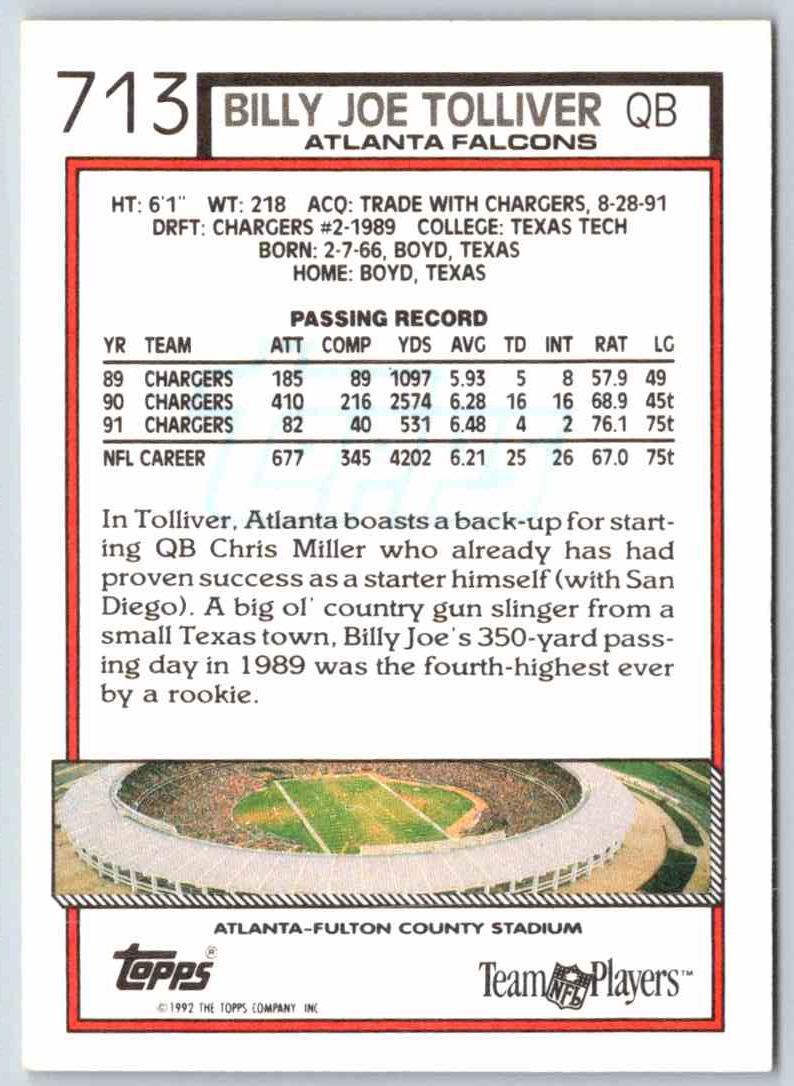 This 1994 Topps Billy Joe Tolliver #713 card is a must-have for any collector. The card features a vibrant, full-color portrait of the quarterback, with a large San Diego Chargers logo in the background. The card also features an action shot of Tolliver from a game, along with his career stats and accomplishments. It's a great piece of memorabilia for any Chargers fan, and a great addition to any sports card collection.
