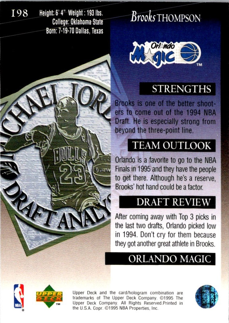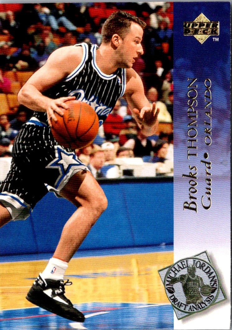 This is your chance to own a piece of NBA history! 1994 Upper Deck Brooks Thompson #198 Orlando Magic card. This card features a sharp-looking action shot of Thompson in his Magic uniform, with bright colors and crisp detail. It's sure to make a great addition to any collection.