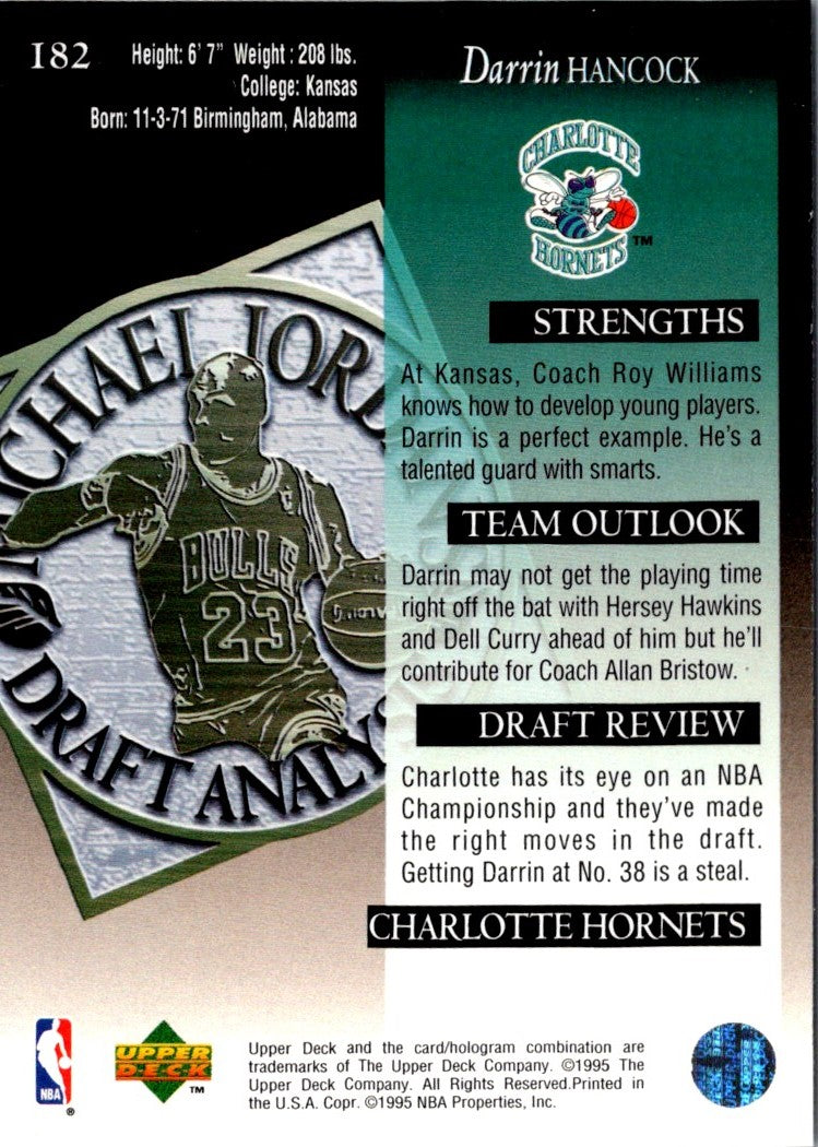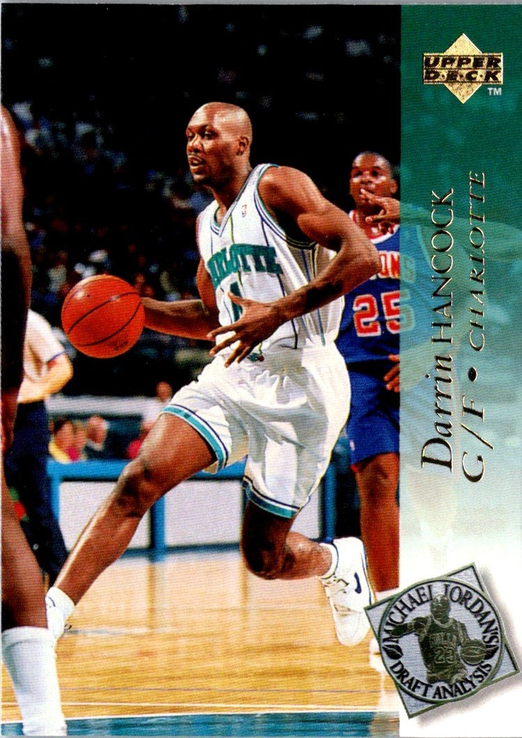 This 1994 Upper Deck Darrin Hancock card #182 features the Charlotte Hornets guard/forward in his red and purple uniform. Hancock was an All-Star in 1996 and went on to become one of the most successful players in Hornets history. This card is a great way to commemorate his time with the team, and it would make a great addition to any sports fan's collection. Get your hands on this piece of history before it's gone!