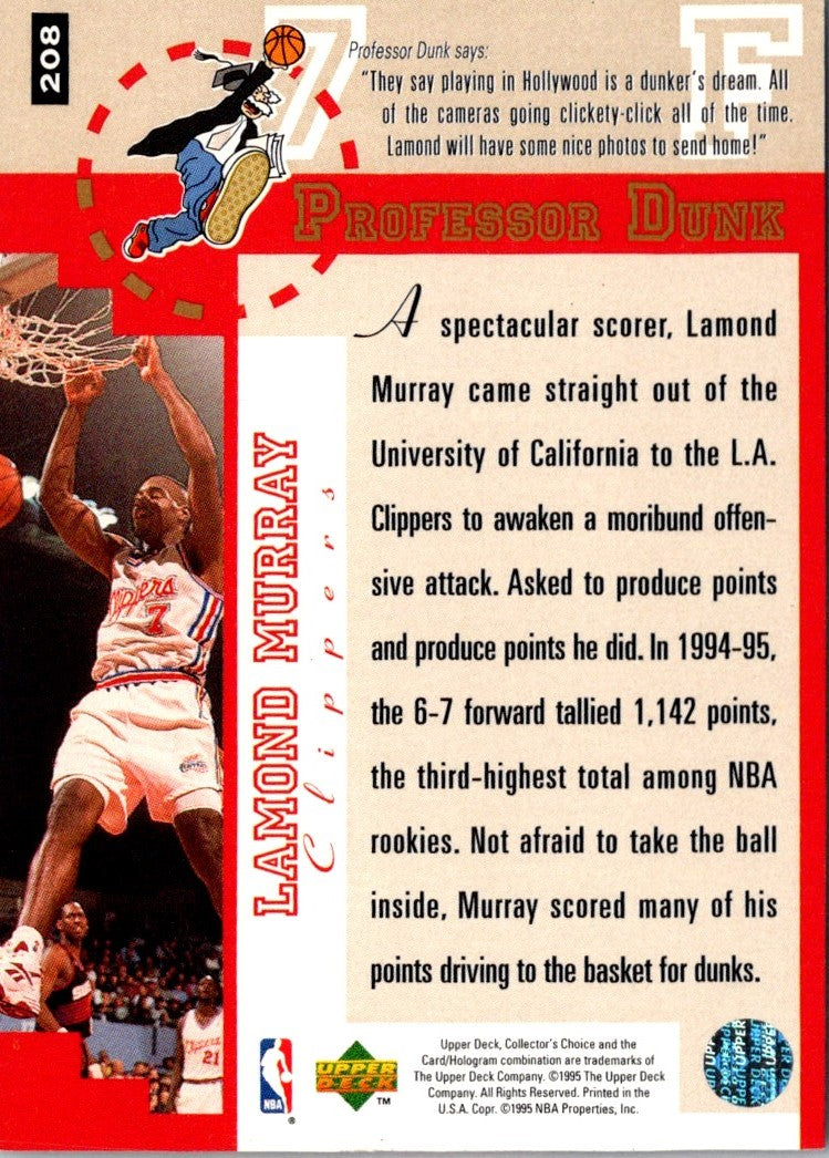 This 1995 Collector's Choice Lamond Murray #208 card is an essential for any basketball fan! Featuring a vibrant and crisp image of the Los Angeles Clippers player, this card is sure to be a great addition to any basketball collection. The card is in excellent condition and made of high quality card stock, making it a great long-term investment. A must-have for any basketball collector, add this card to your collection today!