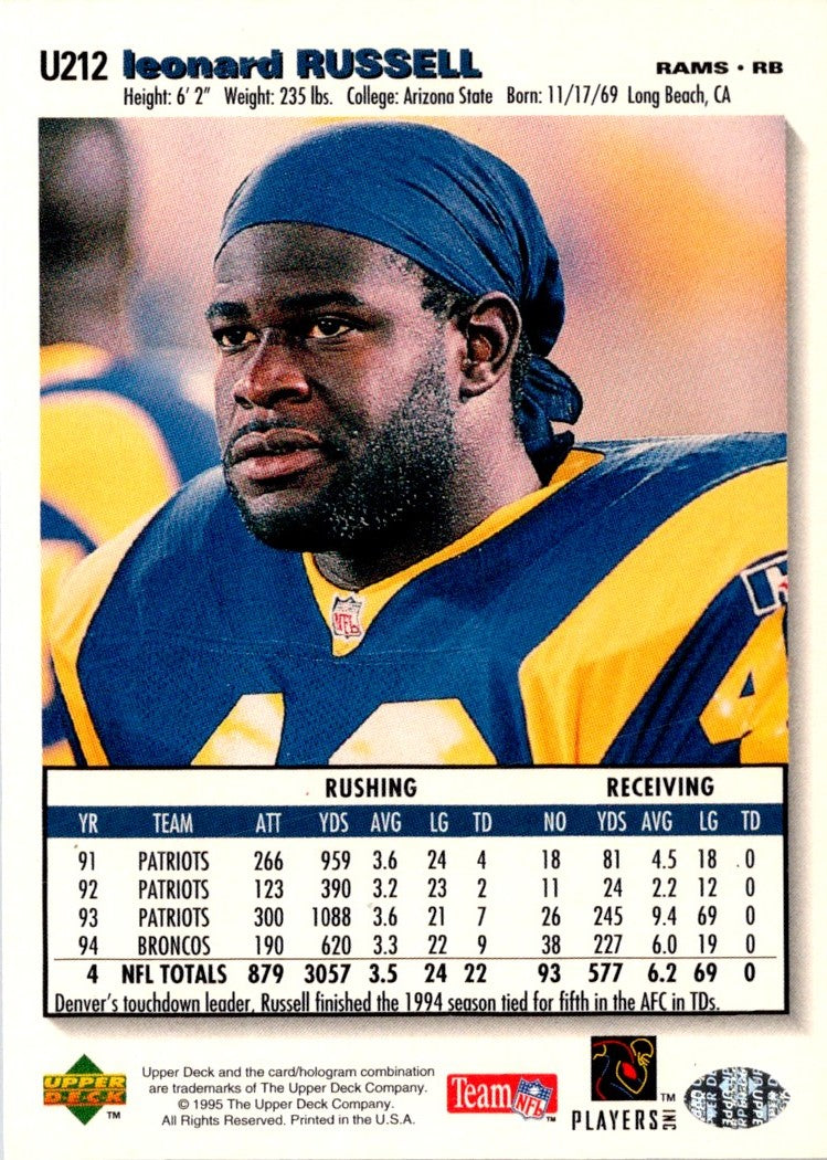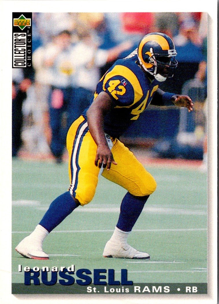 This 1995 Collector's Choice Update Leonard Russell #U212 St. Louis Rams trading card features an action image of the legendary running back on the front, and an overview of his career on the back. This card is in excellent condition and would make an excellent addition to any trading card collection. Whether you're a casual collector or a serious enthusiast, this card is a must-have!