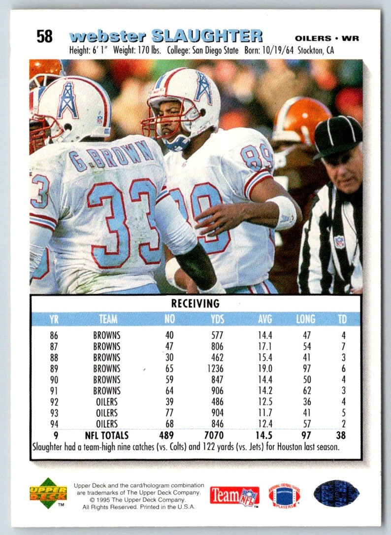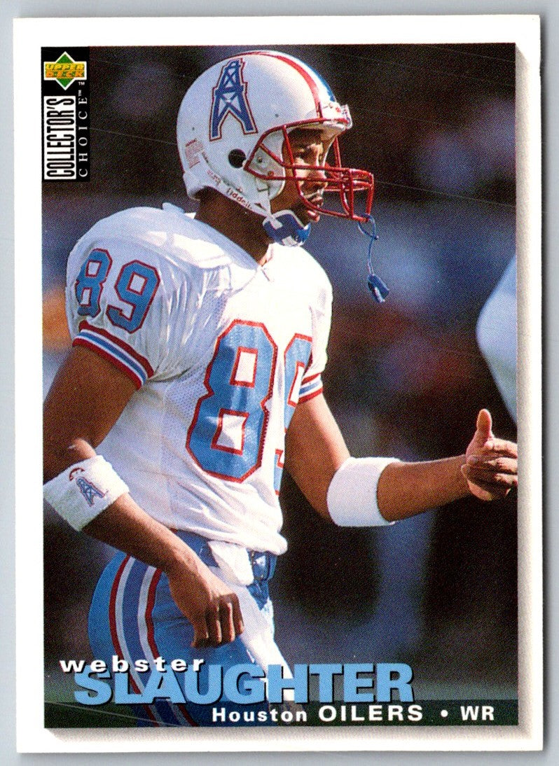This 1995 Collector's Choice Webster Slaughter #58Houston Oilers card is a must-have item for any football fan. The card features a glossy photo of Slaughter in his Houston Oilers jersey, along with vital stats and career accomplishments. The card is in great condition with little to no wear and tear. It's a great addition to any sports memorabilia collection and is sure to be a conversation starter! Get your hands on this card today and add it to your collection!