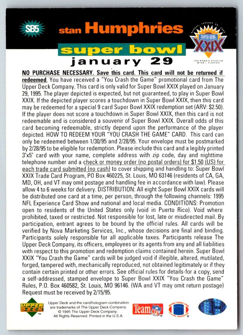 1995 Collector's Choice You Crash the Game Super Bowl XXIX Stan Humphries #SB5