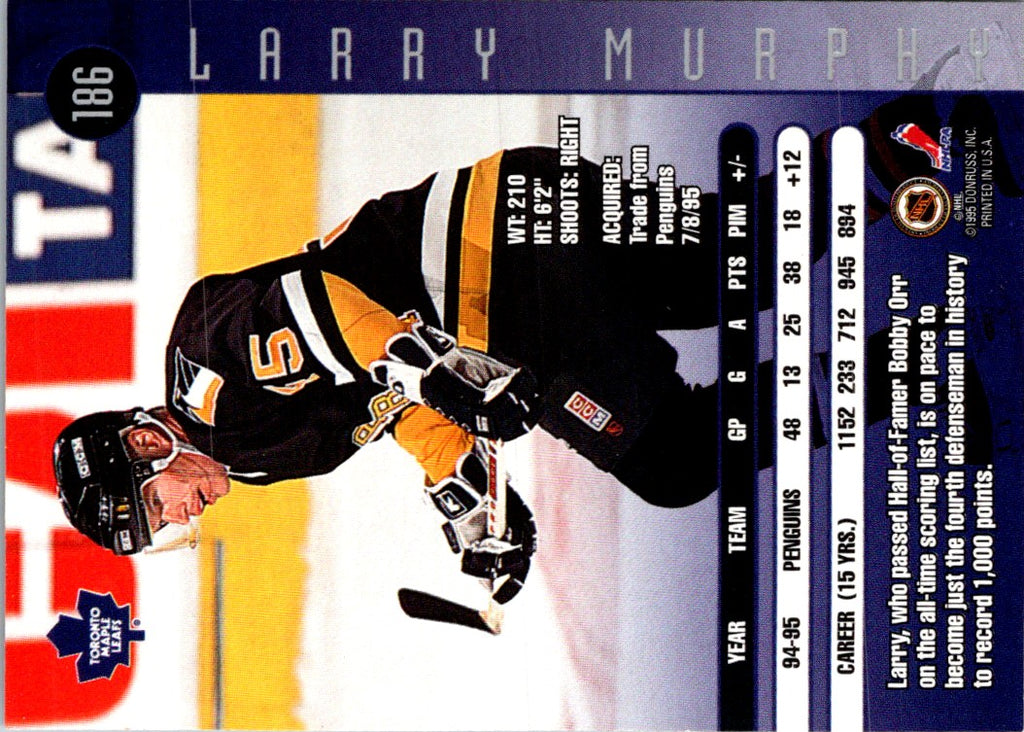 This 1995 Leaf Larry Murphy #186 card is a must-have for any Toronto Maple Leafs fan! Featuring a color image of Murphy in his Maple Leafs jersey, this card is a great way to show your support for the team. The back of the card contains stats and info about Murphy's career, making it a great collectible for any hockey fan. Add this card to your collection today and show your Leafs pride!