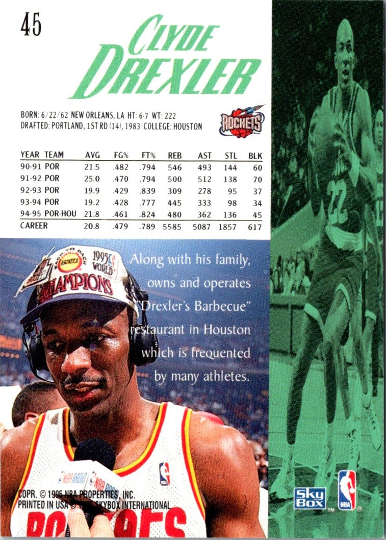This 1995 SkyBox Premium Clyde Drexler #45 Houston Rockets card is the perfect collectible for any fan of the Hall of Fame guard. Featuring a detailed image of Drexler in his signature Houston Rockets uniform, this card is a great way to commemorate one of the greatest players to ever wear their colors. The card features a glossy finish and is in near-mint condition, making it a great addition to any collection.