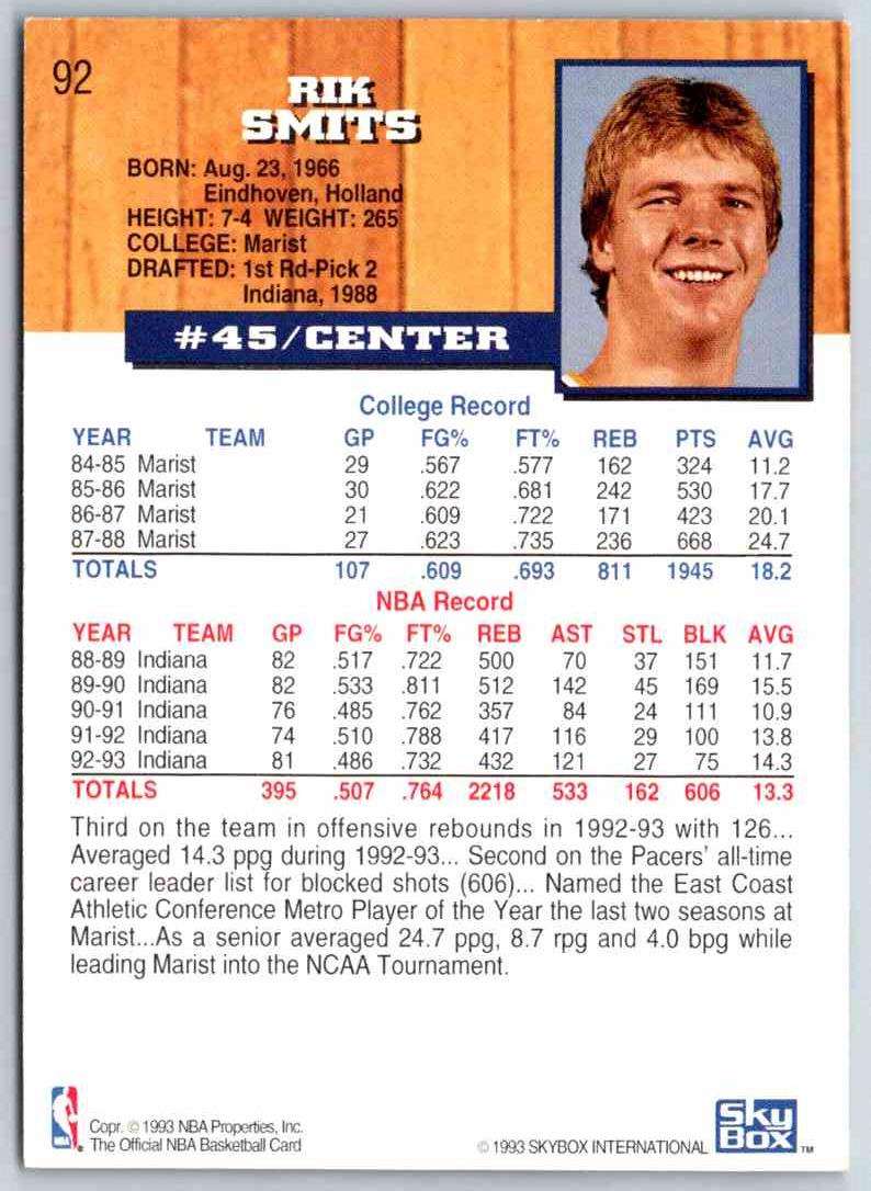 This 1995 Skybox Rik Smits #92 card is the perfect addition to any basketball fan's collection. The card is in excellent condition, featuring a black and white image of Smits in his Indiana Pacers uniform. His name and number are printed in bold red on the front, alongside the Pacers logo and Skybox logo. On the back of the card, you'll find a brief biography of Smits and a detailed statistical summary of his playing career up to the 1995 season. Whether you're a fan of the Pacers or just a basketball card enthusiast, this card is an absolute must-have.