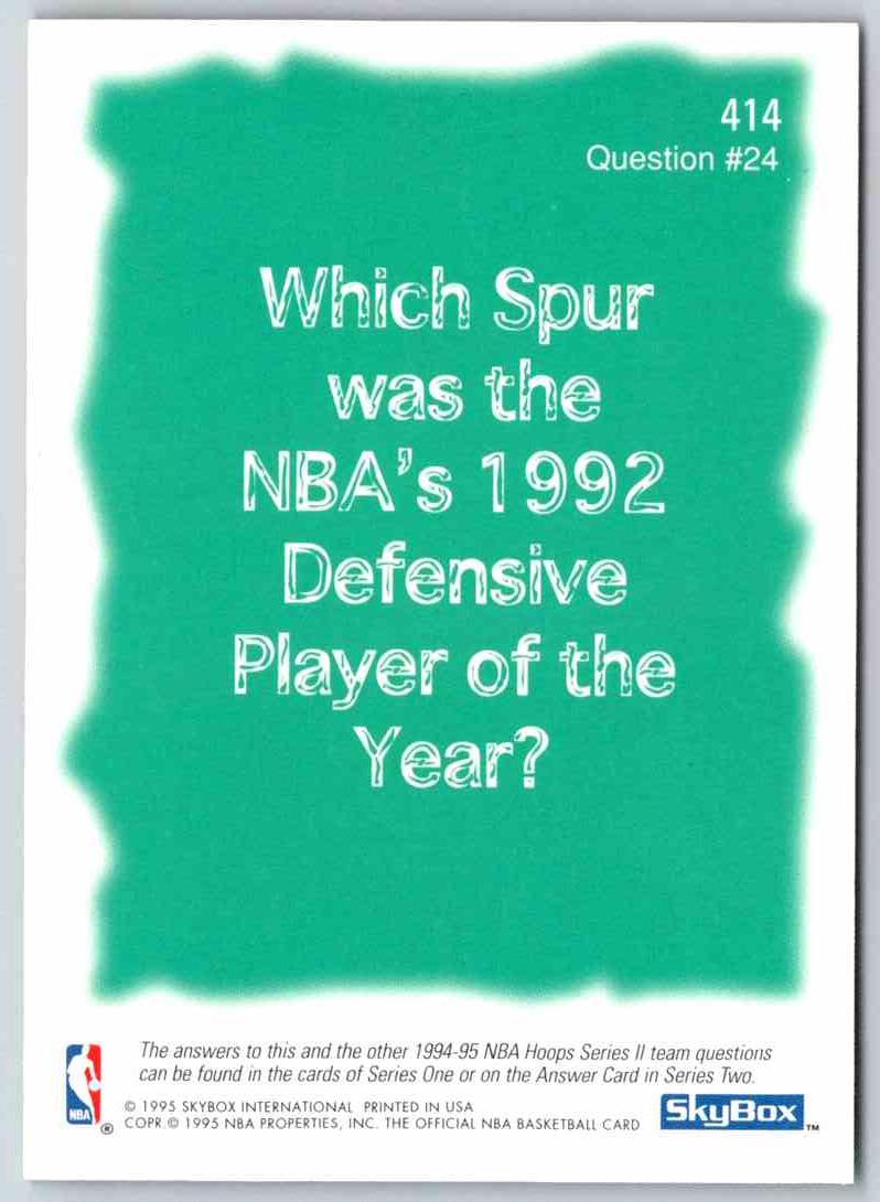 This 1995 Skybox San Antonio Spurs #414 card is the perfect addition to any basketball fan's collection. Featuring a glossy black and white photo of star player Sean Elliott, this card is sure to be the envy of your friends. It's an officially licensed NBA product, printed on thick stock for long-term durability. The back of the card includes detailed stats and information about Elliott's career and accolades, making it a great way to commemorate one of the Spurs' top players. Add this card to your collection today and show your Spurs pride!